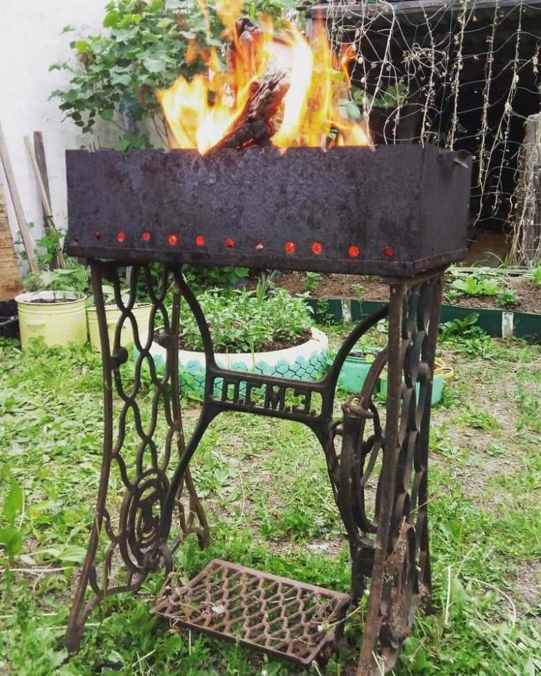 Очень красивым и удобным получится мангал на станине от старой швейной машинки.