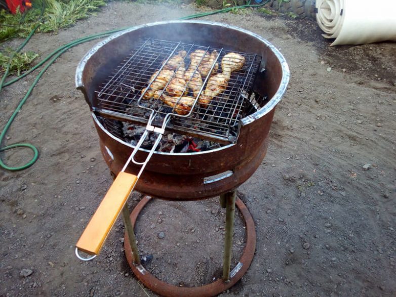 Барабан из старой стиральной машины. Вентиляция в наличии, форма позволяет удобно использовать мангал для приготовления блюд в сковороде, казане, на гриле. И перенести легко, а если металл барабана будет прожжён со временем — что ж, не жалко, не покупная ведь вещь.