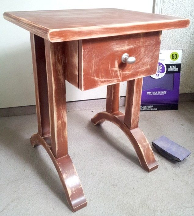 Самый простой способ, позволяющий состарить дерево. Эта техника подходит для обработки как окрашенной, так и неокрашенной древесины. Суть в том, чтобы шлифовать отдельные участки деревянной мебели жесткой наждачной бумагой.
