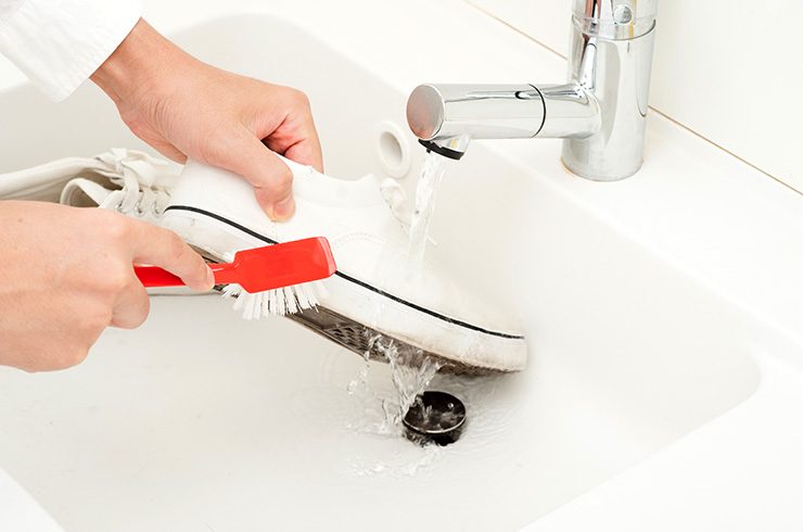 Чтобы кроссовки снова выглядели как новенькие, достаточно применить природный отбеливатель. Выжмите 2−3 столовые ложки лимонного сока на салфетку или губку и вотрите его в поверхность грязной обуви. Повторите манипуляции несколько раз, если одного окажется недостаточно.Машинная стирка