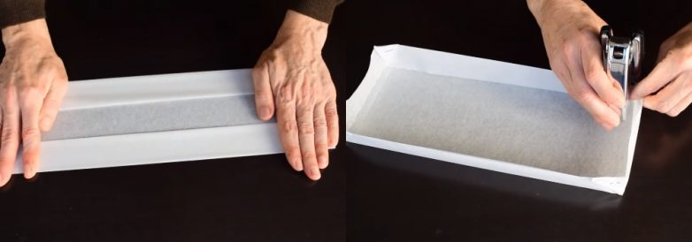 Теперь подготовим форму, в которой будет плавиться пластик. Для этого берем пергаментную бумагу или фольгу и делаем из них форму с бортиками. Это нужно для того, чтобы пластик не вытек во время плавления.