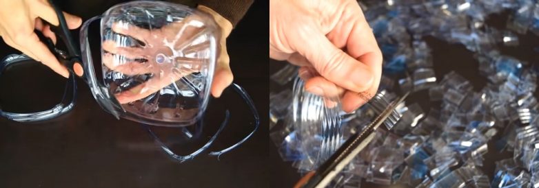 Бутылки необходимо вымыть и высушить. Подготовленные бутылки превращаем в материал для ножа. Для этого сначала «распускаем» бутылки на ленты, а затем нарезаем пластиковые ленты на мелкие квадраты.