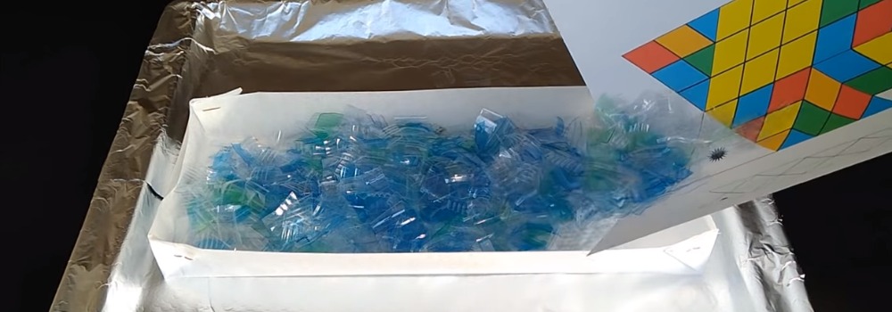Пересыпаем наши нарезанные бутылки в форму и отравляем в духовку, разогретую до 240-250 С°, до тех пор, пока он не расплавится.