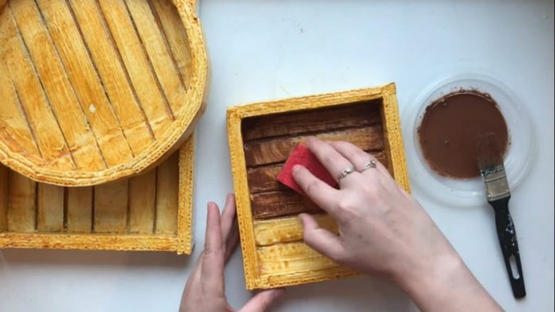 Следующий шаг — придание основного, деревянного оттенка панно. Для этого коричневую краску смешиваем с водой, наносим кисточкой. Затем берем губку и аккуратно стираем слой, кое-где оставляя краску и растягивая её.