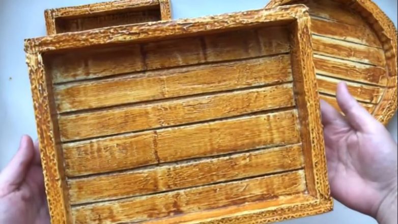 Из кусочков картона, который всегда остается после крупных покупок (коробки), вы можете своими руками сделать декор невероятной красоты — красивейшее панно с бабочкой из картона с имитацией дерева! Выглядит это панно как покупное, дизайнерское — оно, и правда, очень оригинальное.