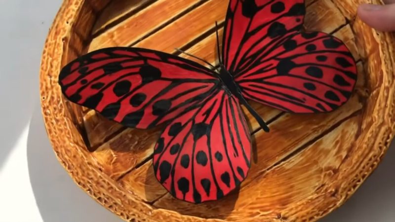Youtube | Dream Fairy DIYОсталась самая малость — приклеить бабочек к основе. Для этого отрезаем кусочек картона, приклеиваем с обратной стороны к бабочкам и затем — к панно.