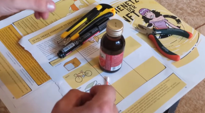 Теперь разрезаем стержень маркера, раскрываем его и достаем волокна, так как нам нужны именно они. Отделенные от стержня волокна перекладываем в баночку со спиртом, закрываем, хорошенько встряхиваем и даем ей немного постоять.