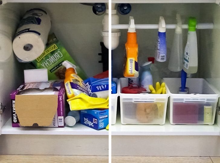 11. Устраняем беспорядок под раковиной с помощью ящиков и телескопической штанги