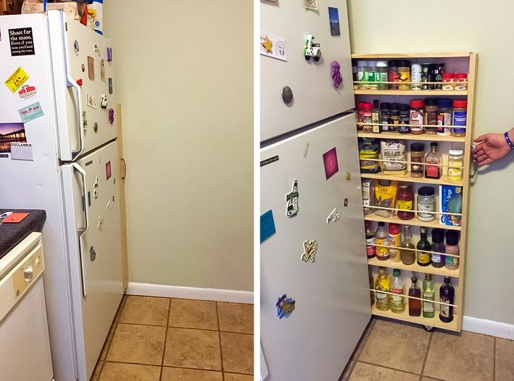 Если у вас есть зазор между холодильником и стеной, его также можно использовать, купив либо самостоятельно смастерив аккуратный плоский стеллаж для продуктов, которые не хранятся в самом холодильнике и занимают чужое место на полках с посудой.