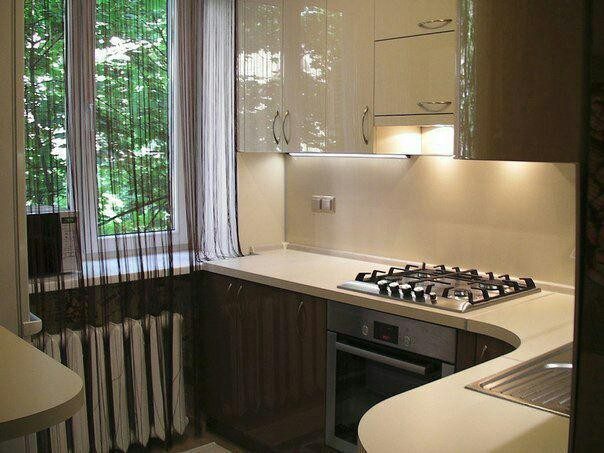 Глянцевая поверхность плюс округлые формы и гардина, максимально пропускающая дневной свет, в сочетании с дополнительной подсветкой рабочей зоны — вот достоинства этой кухни скромных размеров.