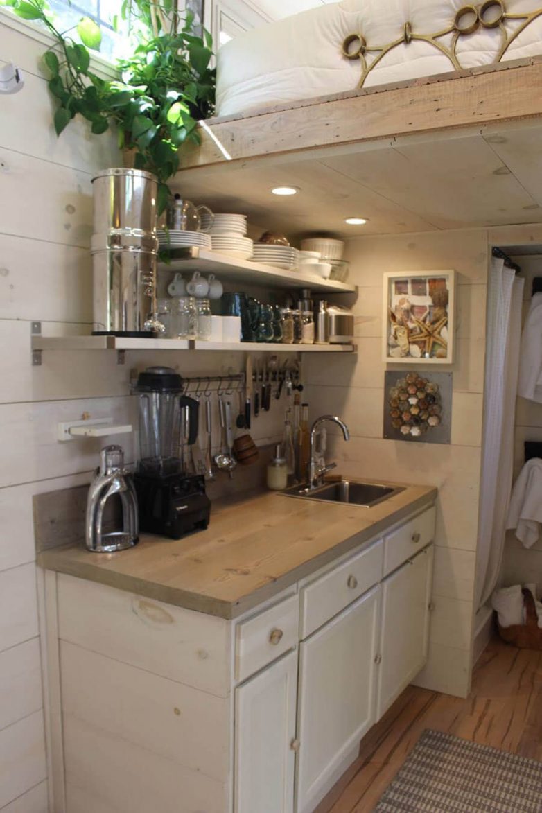 В маленьких кухнях необходимо максимально использовать свободное пространство. Барная стойка вместо стола и подвесная полка под потолком – сделаю кухню более функциональной.