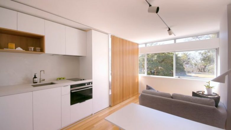Двигающаяся перегородка отделяет спальную и кухонную зону от остальной квартиры: