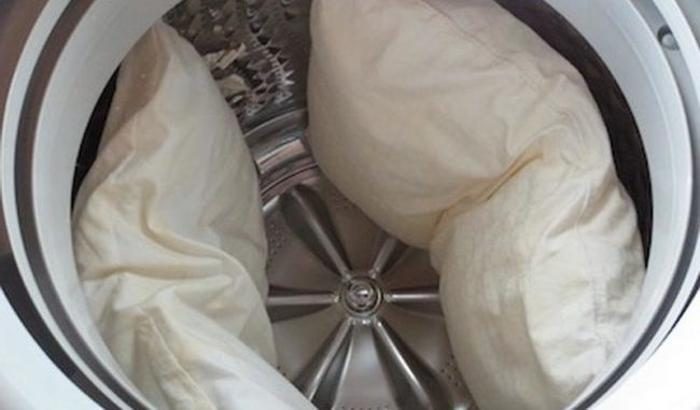 Положите подушки в стиральную машину (лучше стирать сразу две, так машинка сможет сохранять баланс, и подушки не будут биться о стенки)