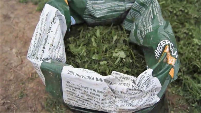 В заполненных ёмкостях нужно проделать небольшие дренажные отверстия. В конце сезона из мешков всё высыпать и утилизировать их не нужно. Эта тара может послужить не менее 3 лет. К осени нижний слой перегнивает, всё наполнение оседает. На следующий год нужно будет досыпать свежей травы и земли и можно вновь использовать мешки в деле.