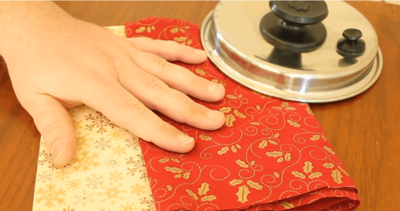 Чтобы раскроить детали, достаточно приложить крышку к ткани, обвести ее, а затем вырезать 2 круга разного цвета. Совмещаем круги между собой лицом внутрь.