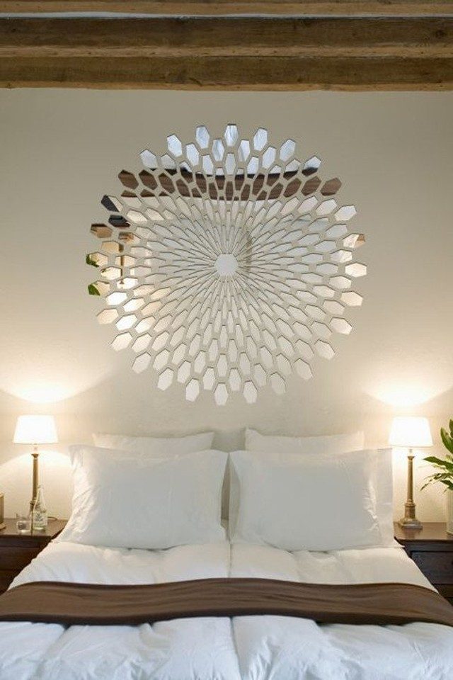 Пчелиные соты Если места для объемного изголовья нет, комната очень маленькая или просто не хочется заниматься изготовлением какого-либо изголовья, то можно попробовать самый простой вариант — покрасить стену или декорировать ее обоями. Так получится акцентировать внимание на одной из стен, отвлечь внимание от изъянов пространства, освежить его и придать ему стильный вид. Например, обозначить место изголовья интересными геометрическими узорами или выделить яркой краской. Креативно будет смотреться грифельная краска и нарисованное на ней мелом изголовье кровати.
