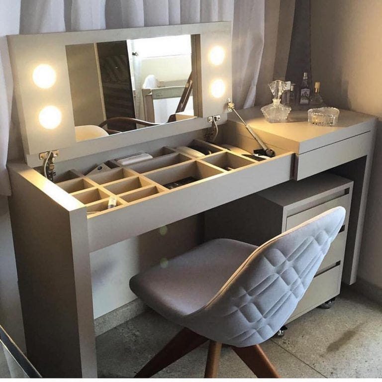 Стол с секретом дополнен не только системой хранения для тысячи мелочей и передвижной тумбой, но даже зеркалом.