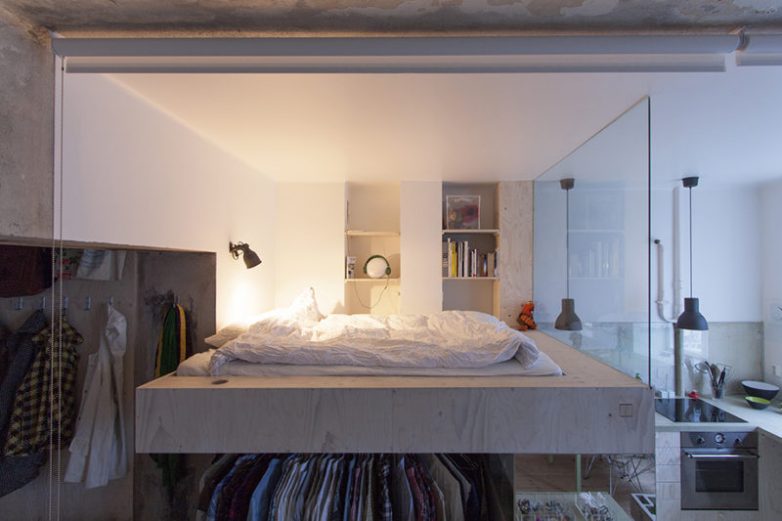 Чтобы максимально использовать свободное пространство и не загромождать комнату шкафом, было принято решение поднять кровать на высокую платформу. Место под кроватью используется в качестве гардероба.