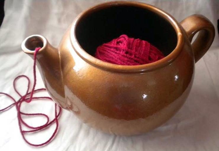 Тем, кто любит вязать, клубок нитей необходимо положить в маленький керамический чайник, просунув кончик сквозь носик. Это предупредит запутывание нитки. К тому же в таком случае кот не станет играть и мешать работе.