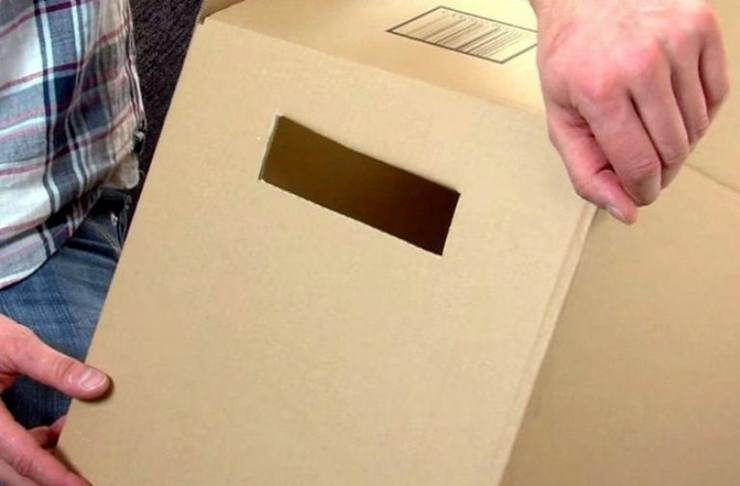 Если в коробке сделать прорезь, — коробка по углам прорези порвется при поднятии тяжести. А если лёгкая,- и так можно хоть малярным скотчем ручки сделать)