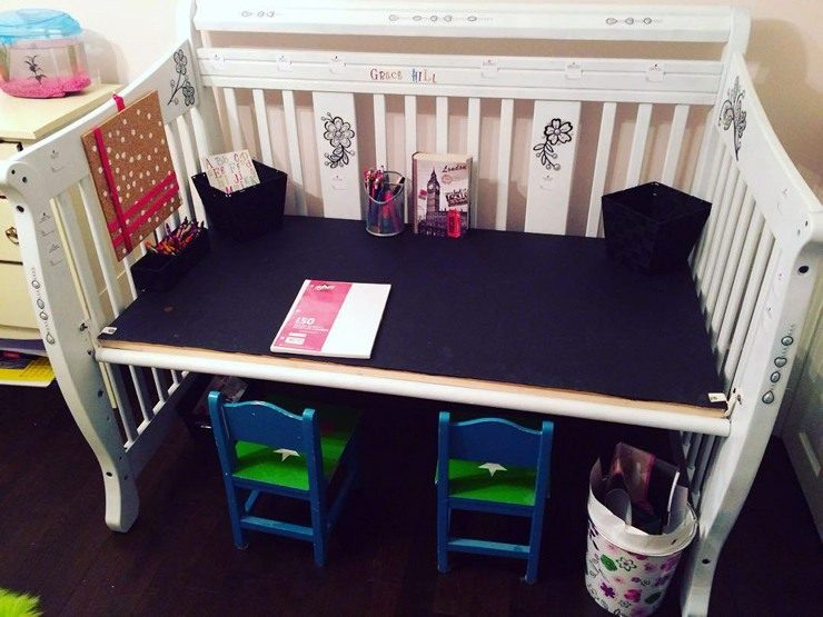 Старую детскую деревянную кроватку для младенца можно превратить в красивый столик. Для этого необходимо лишь заказать стекло, которое будет служить столешницей.