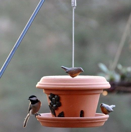 Чашка и блюдце, которыми вы уже не пользуетесь, может легко превратиться в кормушку для птиц, которая летом может стать для них поилкой. Для этого достаточно приклеить чашку к блюдцу и повесить на крючок за ручку, на цепочках или веревках.