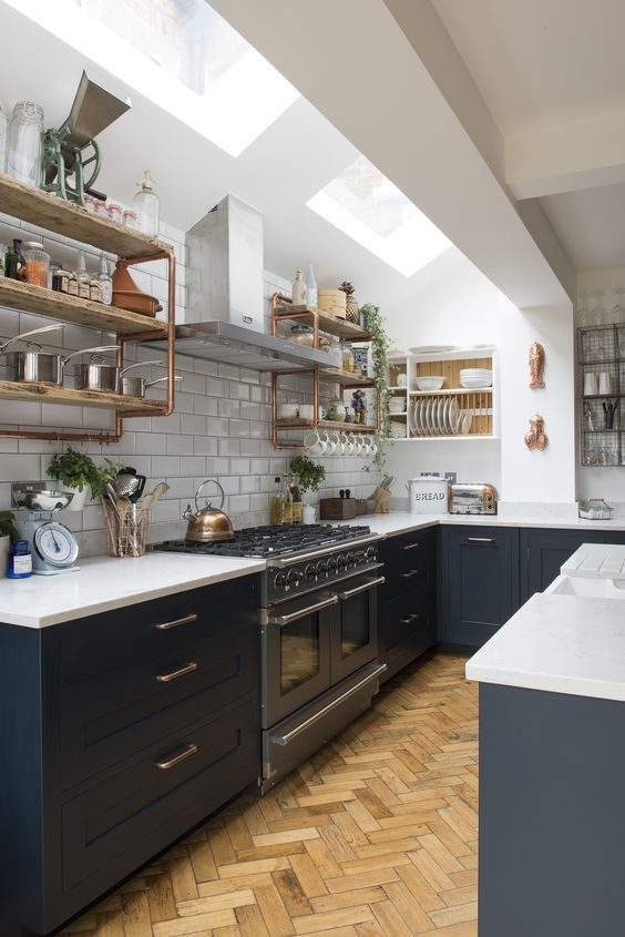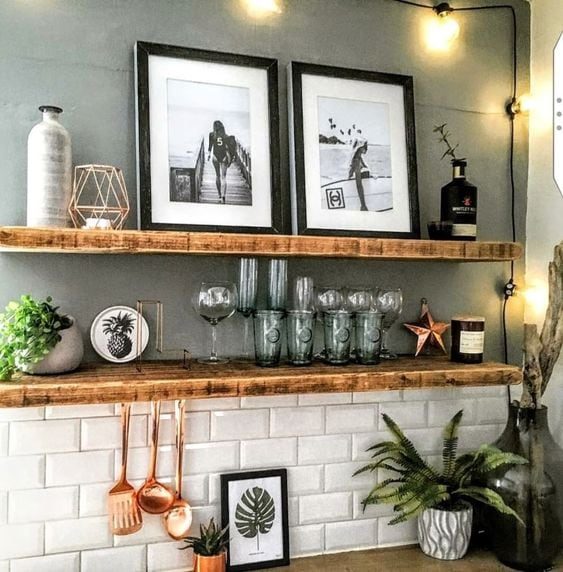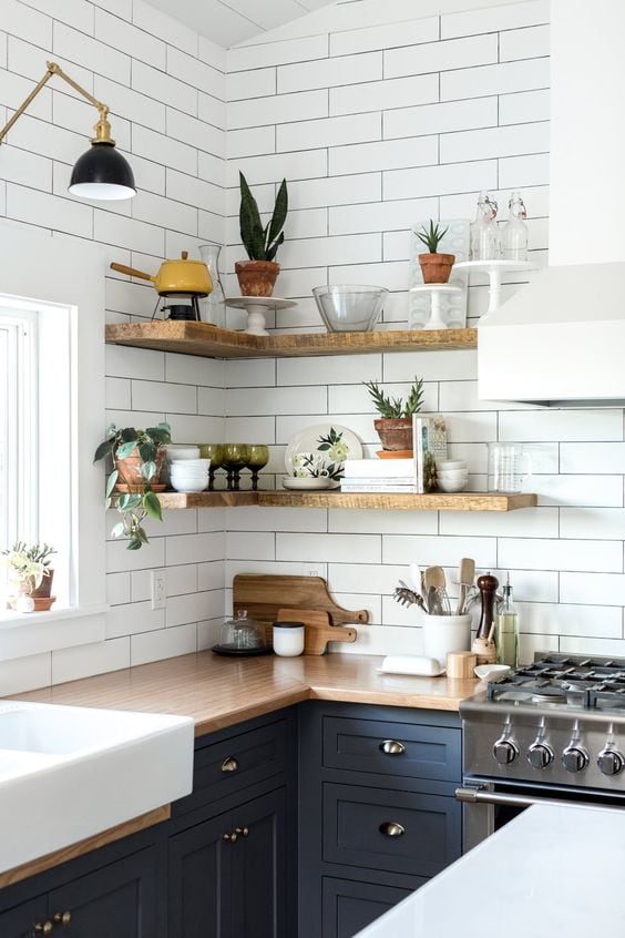 Здесь можно не только хранить посуду, но и украсить ими кухонный интерьер с помощью цветочных горшков, плетёных корзинок и иного необычного декора, расставленного на полках. Полки могут быть простыми вертикальными или угловыми, могут занимать всю стену или же только какую-то часть: вариантов, действительно, очень много. Вот лишь 10 ярких примеров стильных открытых полок на кухне: