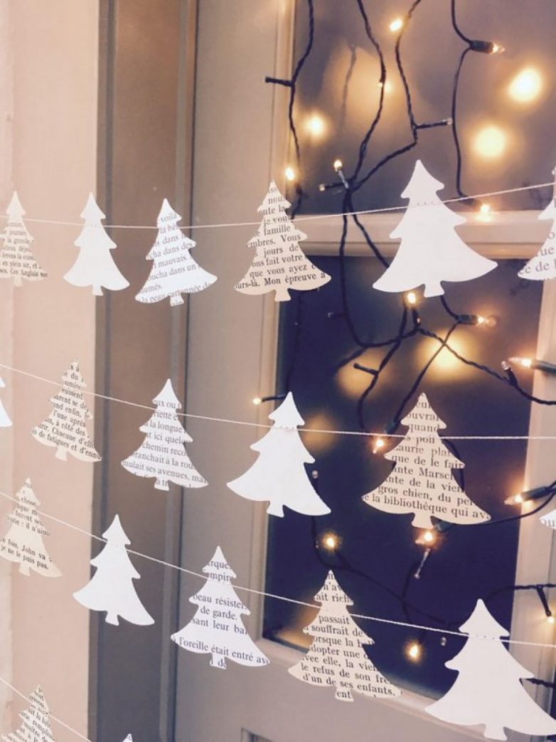Повесьте гирлянду на окно, пусть все знают, что у вы к празднику готовы. Вырежьте из газет или старых тетрадей елочки и закрепите их на нитке. Получившуюся гирлянду растяните по комнате.