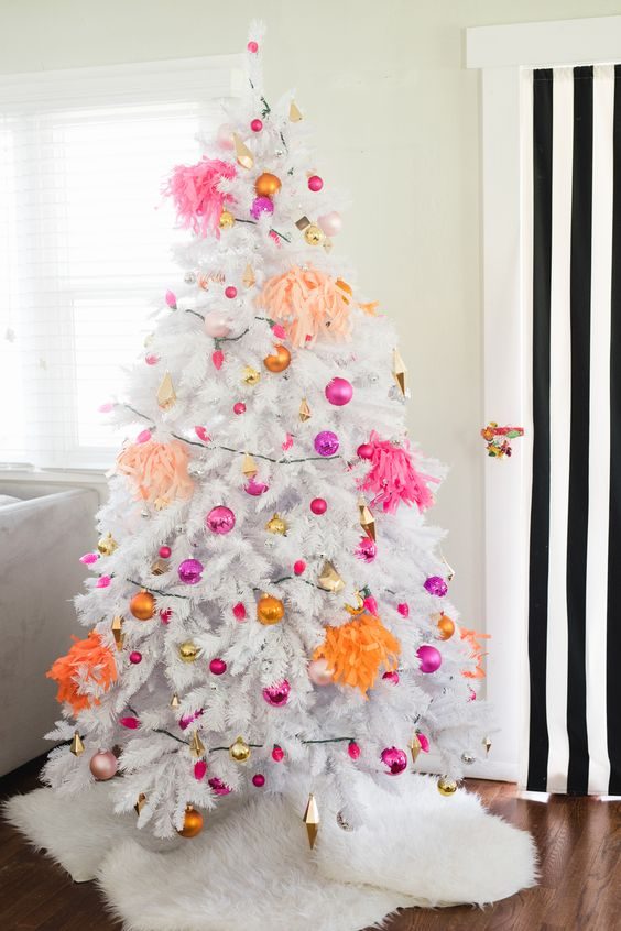 и смело на белой елке будут выглядеть оранжевые, розовые и украшения цвета фуксия.