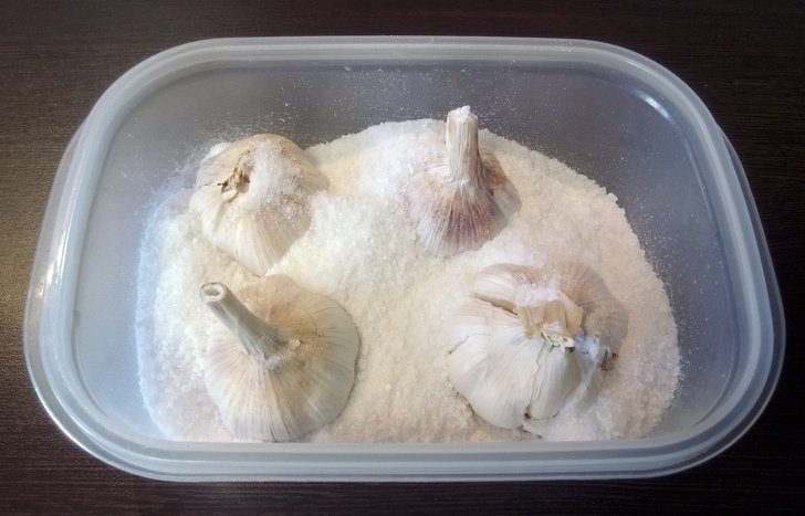 Чеснок не потеряет своей свежести и вкуса, если положить головки в небольшую коробку или контейнер и покрыть их слоем крупной соли.