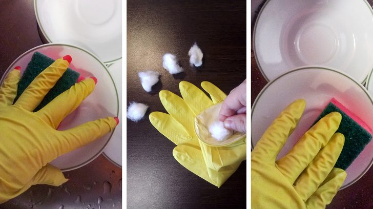 Чтобы ногти случайно не прокалывали резиновые перчатки при стирке или чистке, поместите кусочек хлопка на каждый палец внутри перчатки.