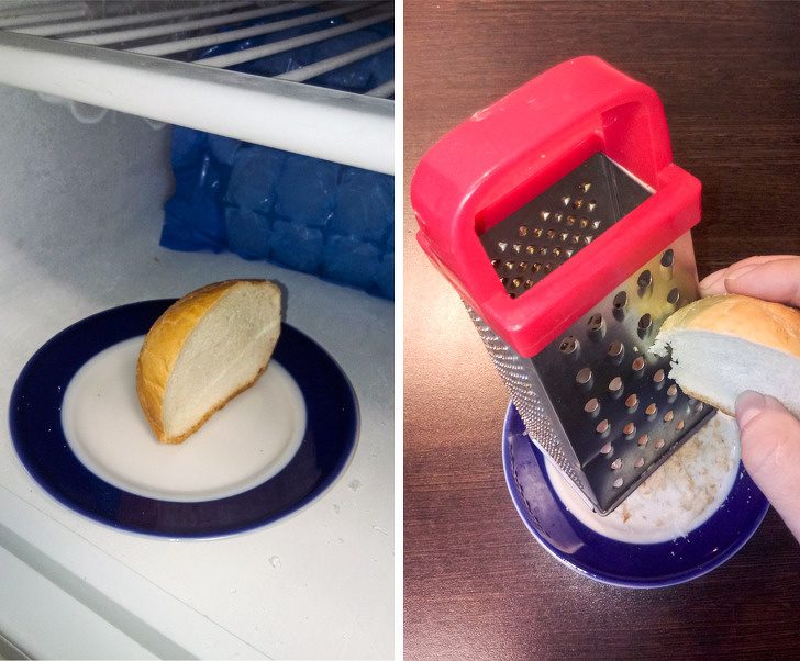 Самый простой способ приготовить панировочные сухари — сначала заморозить кусок хлеба в холодильнике, а затем натереть его на терке.