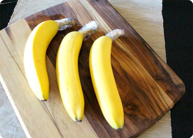 Оберните пластиковой пленкой или алюминиевой фольгой кончики стеблей бананов, чтобы замедлить процесс созревания