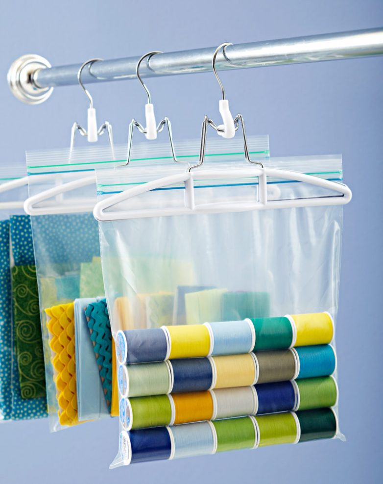 Для удобного хранения небольших предметов и швейных принадлежностей используйте ZIP-пакеты и небольшие вешалки, это позволит освободить места на столе и полках.