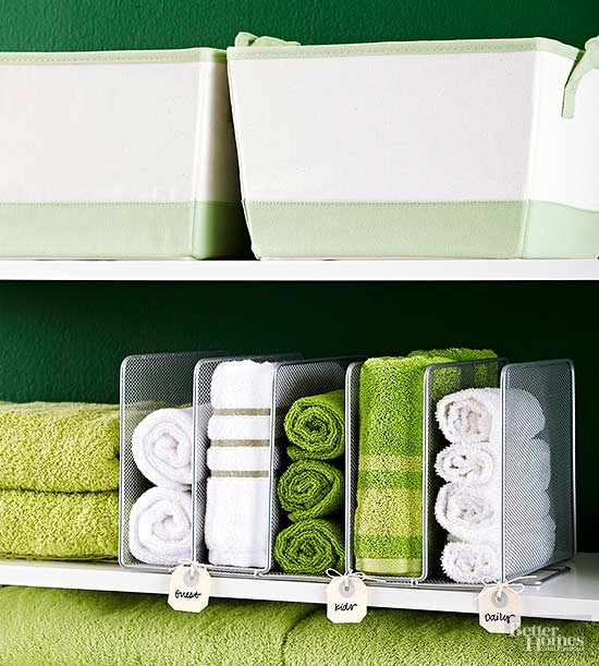Сетчатые металлические подставки для бумаг можно использовать для хранения полотенец, свернутых в рулоны. Так Вы сможете аккуратно достать полотенца, которые лежат даже в самом низу стопки.