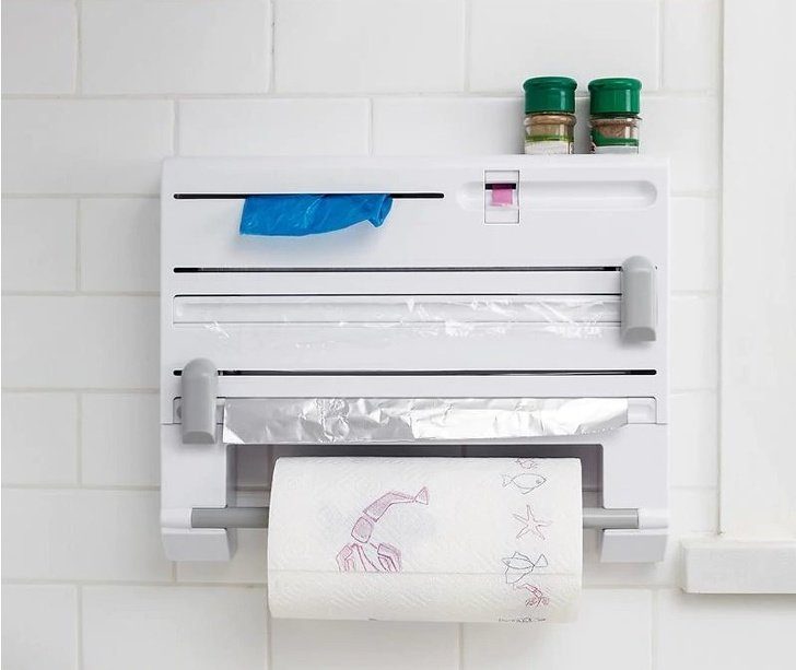 Этот органайзер позволяет хранить в одном месте мешки для мусора, фольгу, пленку и даже клейкую ленту. Кроме того, специальный механизм позволит вам вырезать ровно необходимое количество фольги либо плёнки.