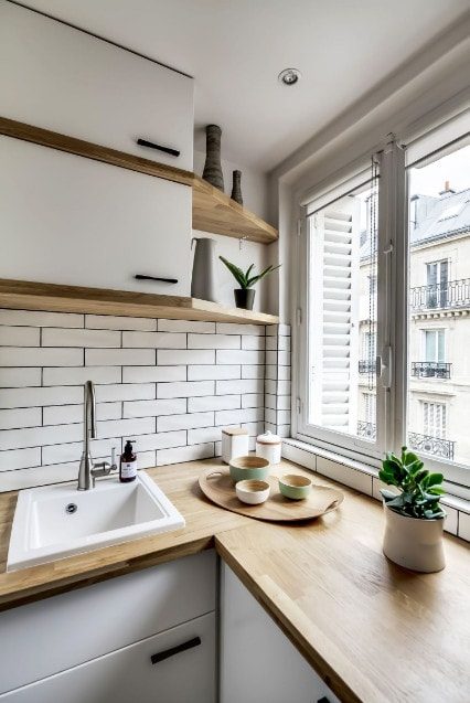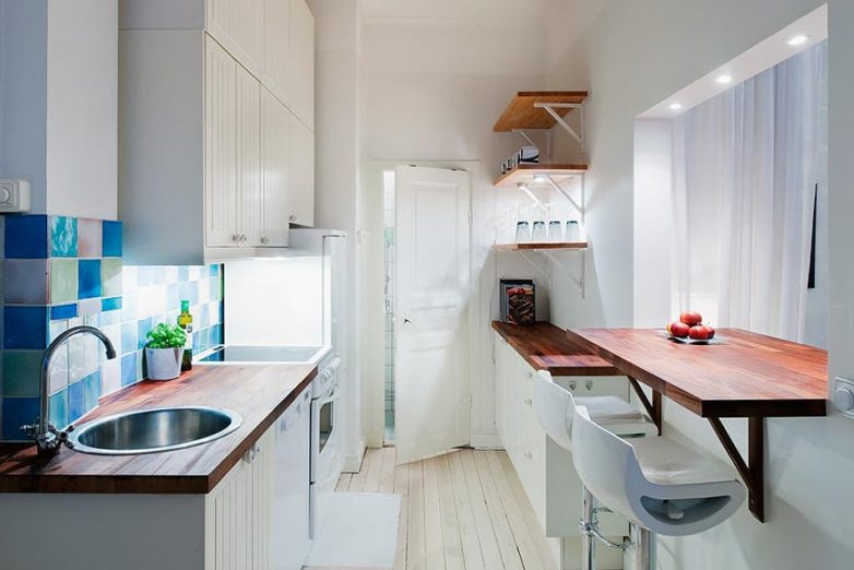 Стол-подоконник белого цвета поможет визуально увеличить площадь маленькой кухни.
