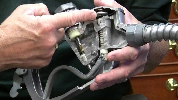 Сам же механизм работы заправочного пистолета действует следующим образом: после нажатия на рычаг открывается шток клапана и бензин начинает движение к баку. Затем топливо проходит через узкое кольцо и наступает так называемый эффект Вентури — скорость потока жидкости увеличивается, а давление наоборот, снижается. Поэтому кольцо также называется по имени эффекта.