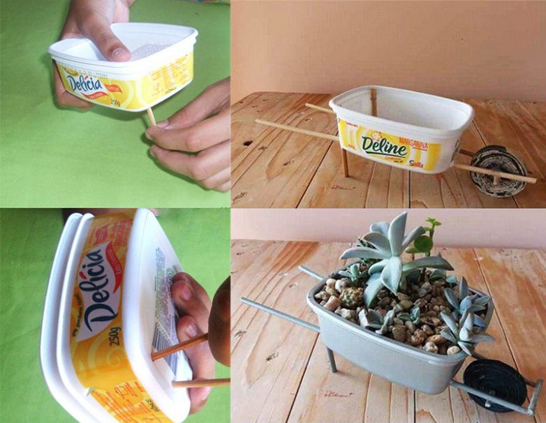 В несколько простых шагов пластиковую коробочку можно превратить в приятное для глаз украшение для дома. Достаточно лишь прикрепить шпажки (или другие палочки) в нужных местах и покрасить всё в желаемый цвет. Можно сажать в такую тележку суккуленты или другие небольшие растения.