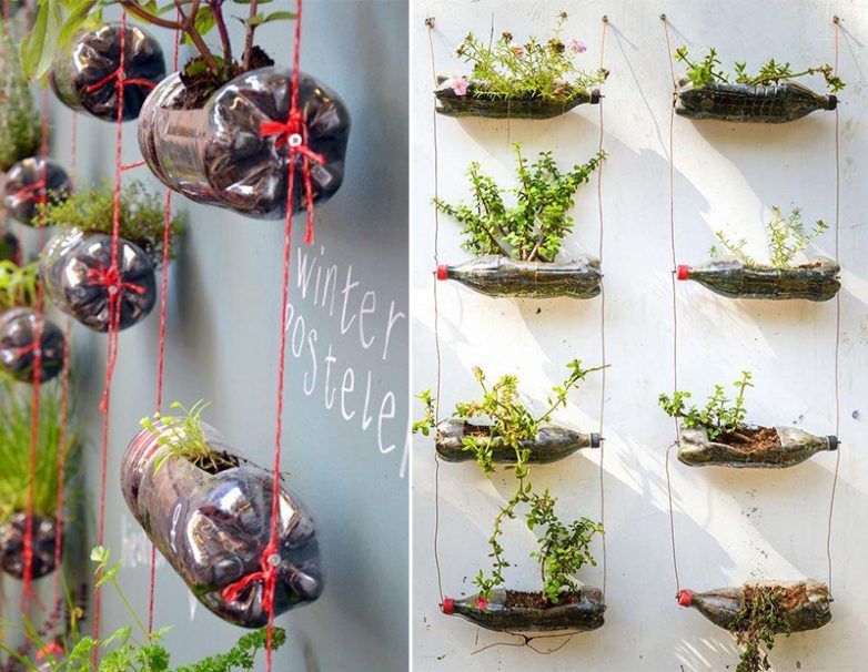Для воплощения этой идеи в жизнь необходимо зафиксировать веревки на бутылке соответствующим образом и закрепить на стене, где будет размещаться такой маленький подвесной сад.