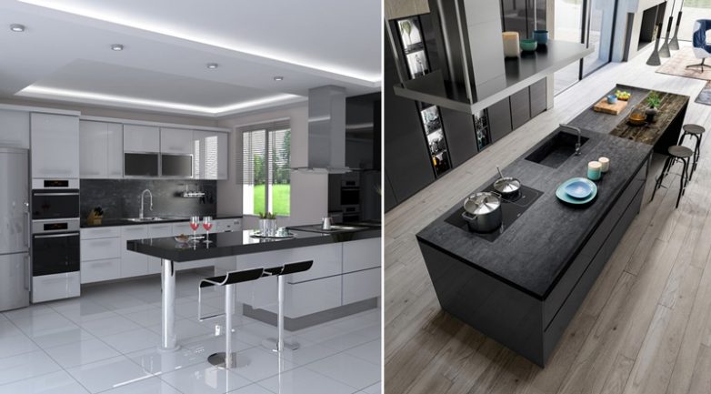 Сочетание черного цвета в интерьере с белым хорошо будет выглядеть на кухне. Здесь предпочтительно выбирать глянцевую поверхность, чтоб не приходилось всё тщательно натирать каждый день (на матовых поверхностях пятна просто-таки бросаются в глаза и хуже выводятся).