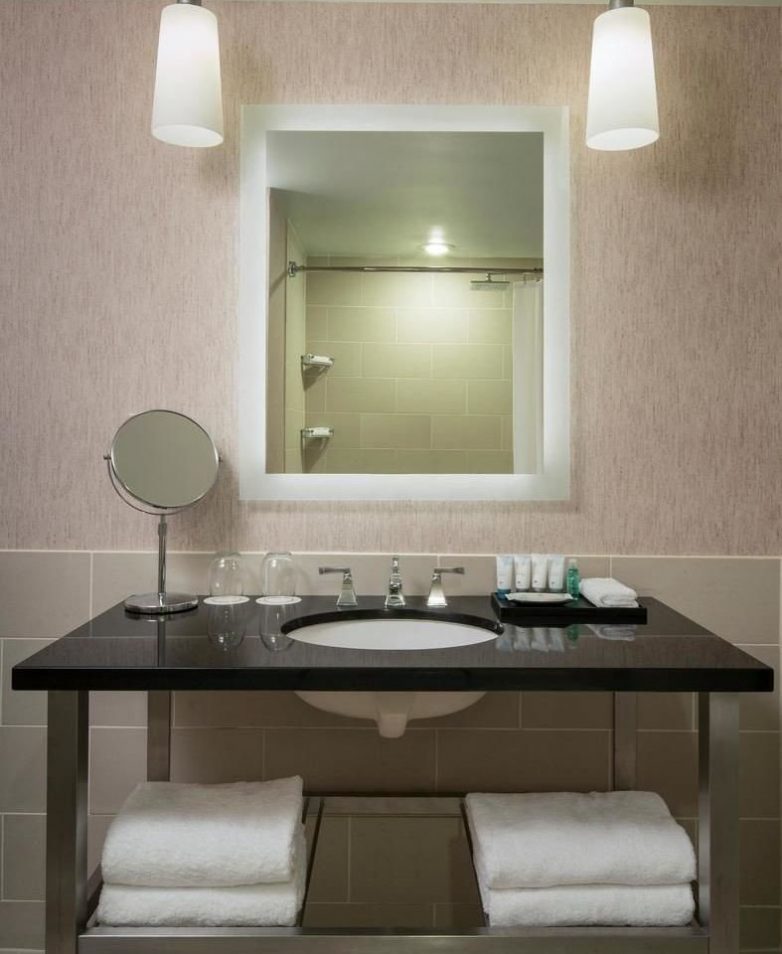 Сделав край умывальной тумбы мягким и округлым, вы получите свободное пространство и меньше вероятности наткнуться на угол.