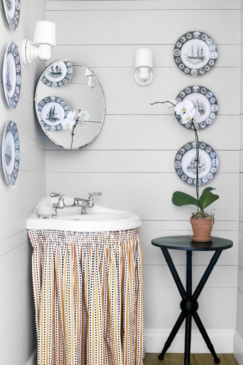 Завесив пространство под раковиной, вы скроете возможный беспорядок и создадите ощущение уюта. Рядом поставьте маленький столик с открытым основанием. Поставьте на него свечи или цветы.