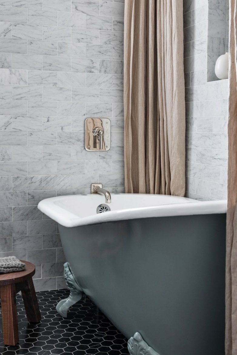 Занавеску, которая больше похожа на штору, чем на обычную пластиковую занавеску для душа, разделите на две стороны. Льняная занавеска из натуральной ткани добавит тепла в прохладное пространство.