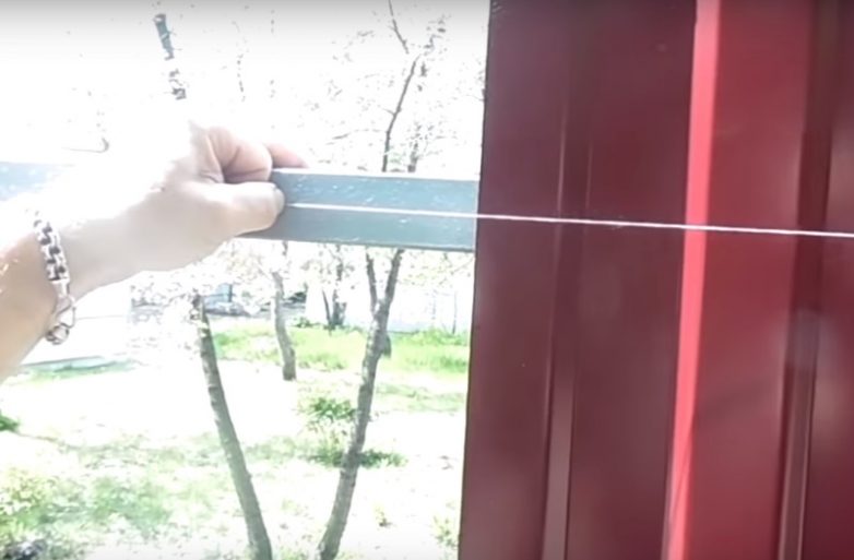 Чтобы сделать забор из профнастила ровным, натяни шпагат по всей длине. А через каждые 2,5 м вбей колышки.