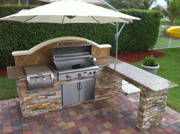 Зону приготовления пищи на этой летней кухне легко совместить с обеденной, главное знать, с какой стороны подойти. Удлиненная столешница и достаточный отступ от края мощенной площадки позволяют приставить стулья в любом месте.