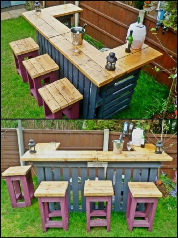 А это уже бюджетный вариант: компактный столик-стойка со скрытой тумбой для хранения дополнен добротными табуретами. Для создания этой переносной обеденной зоны использованы паллеты и остатки доски.
