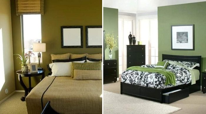 Зеленому цвету найдется место и в интерьере спальни. Тот же сочный зеленый или салатовый оттенки способствуют проявлению страсти не хуже красного цвета. Но при этом в них нет агрессивности последнего, можно сказать, это «средство» действует более мягко.Обои с листвой, ночной столик или комод с зеленым декором, салатовое постельное белье. Для самой спокойной зоны дома отлично подойдет сочетание зеленого цвета с белым. Стены спальни можно выкрасить и в оливковый. Этот цвет дает чувство защищенности.