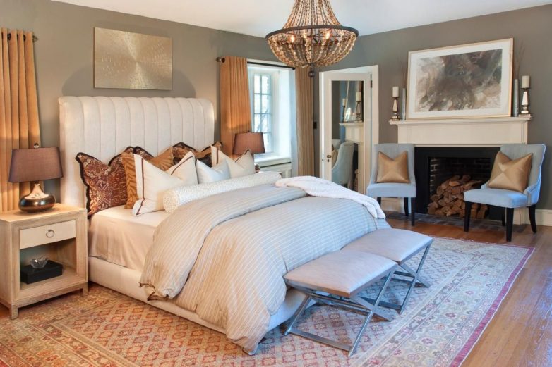 Этот номер с камином, роскошным постельным бельем и теплым ковриком представляет собой образец уютной гостиной. Но один аспект, который действительно улучшает пространство — это выбор мягкого освещения. Если верхнее освещение является обязательным, то люстра – это отличный способ внести уют и свет в комнату.