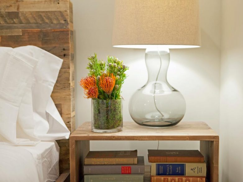 Теплые деревянные акценты и ваза, наполненная свежими цветами, объединяются в этом тихом месте, чтобы создать рай для любителей природы. Со стопкой книг, помещенных на полку ночного столика, вам, возможно, никогда не придется покидать этот спокойный оазис.